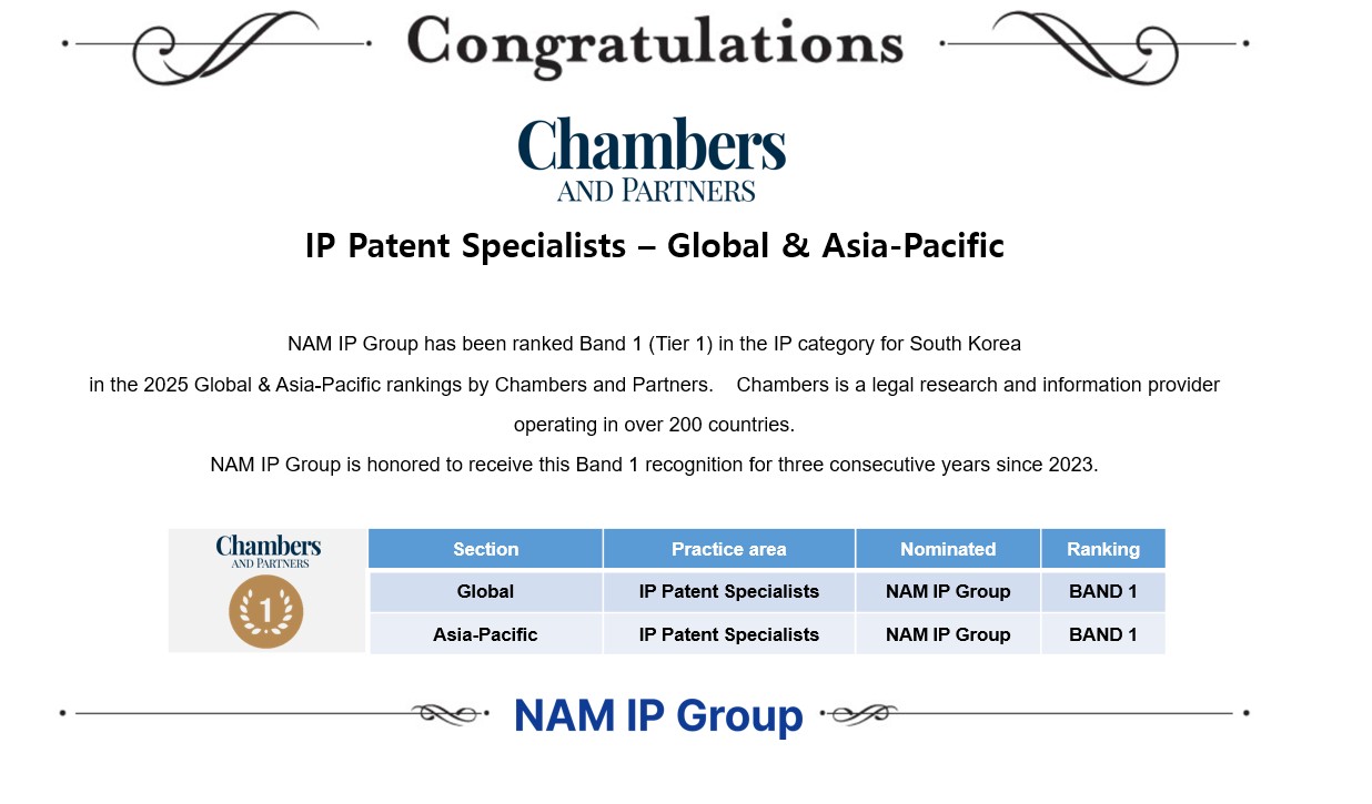 NAM IP Group has been ranked Band 1 (Tier 1) in the IP category for South Korea