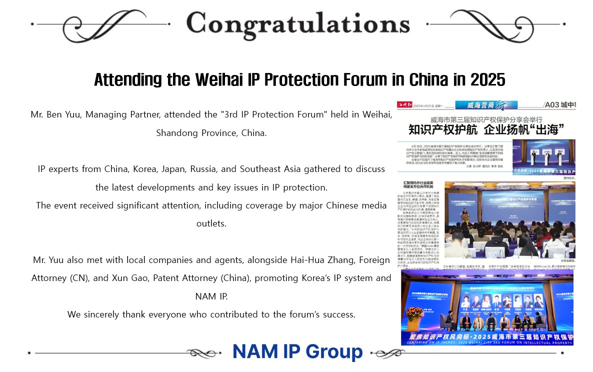 Mr. Ben Yuu, Managing Partner, attended the "3rd IP Protection Forum" held in Weihai, Shandong Province, China.