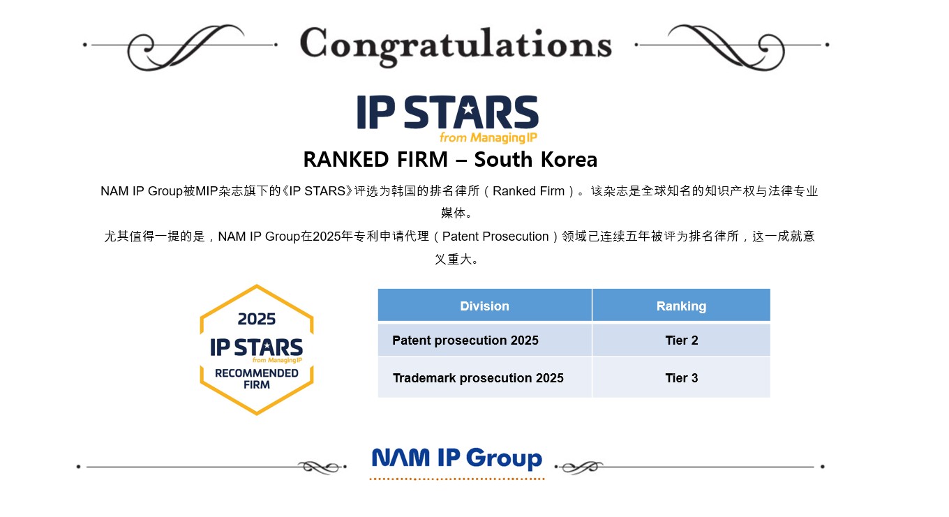 NAM IP Group的成员被MIP杂志旗下的《IP STARS》评选为“专利之星”(Patent Star)和“杰出个人”(Notable Individual)。该杂志是全球领先的知识产权与法律专业刊物。 尤其值得一提的是,代表专利师柳炳浩(Byeongho Yoo)与合伙人专利师李瑞英(Seoyoung Lee)已连续四年被评为“专利之星”,这一荣誉具有非凡意义。